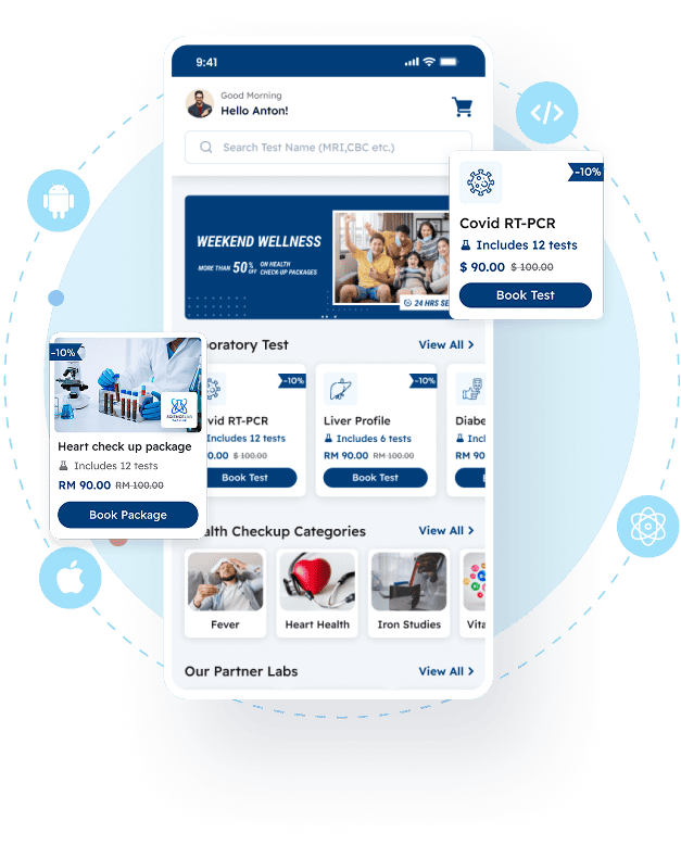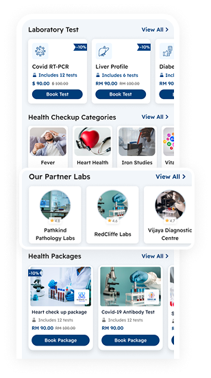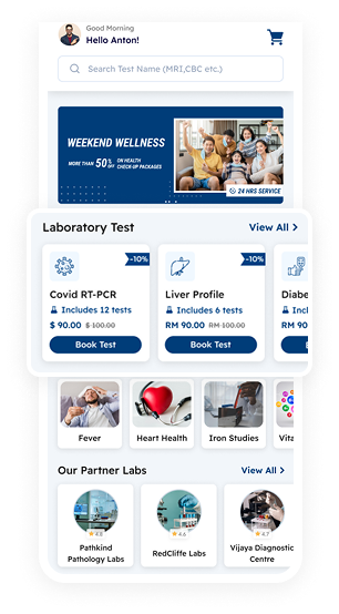 Our customer website and mobile app in android and iOS are available to book lab tests.